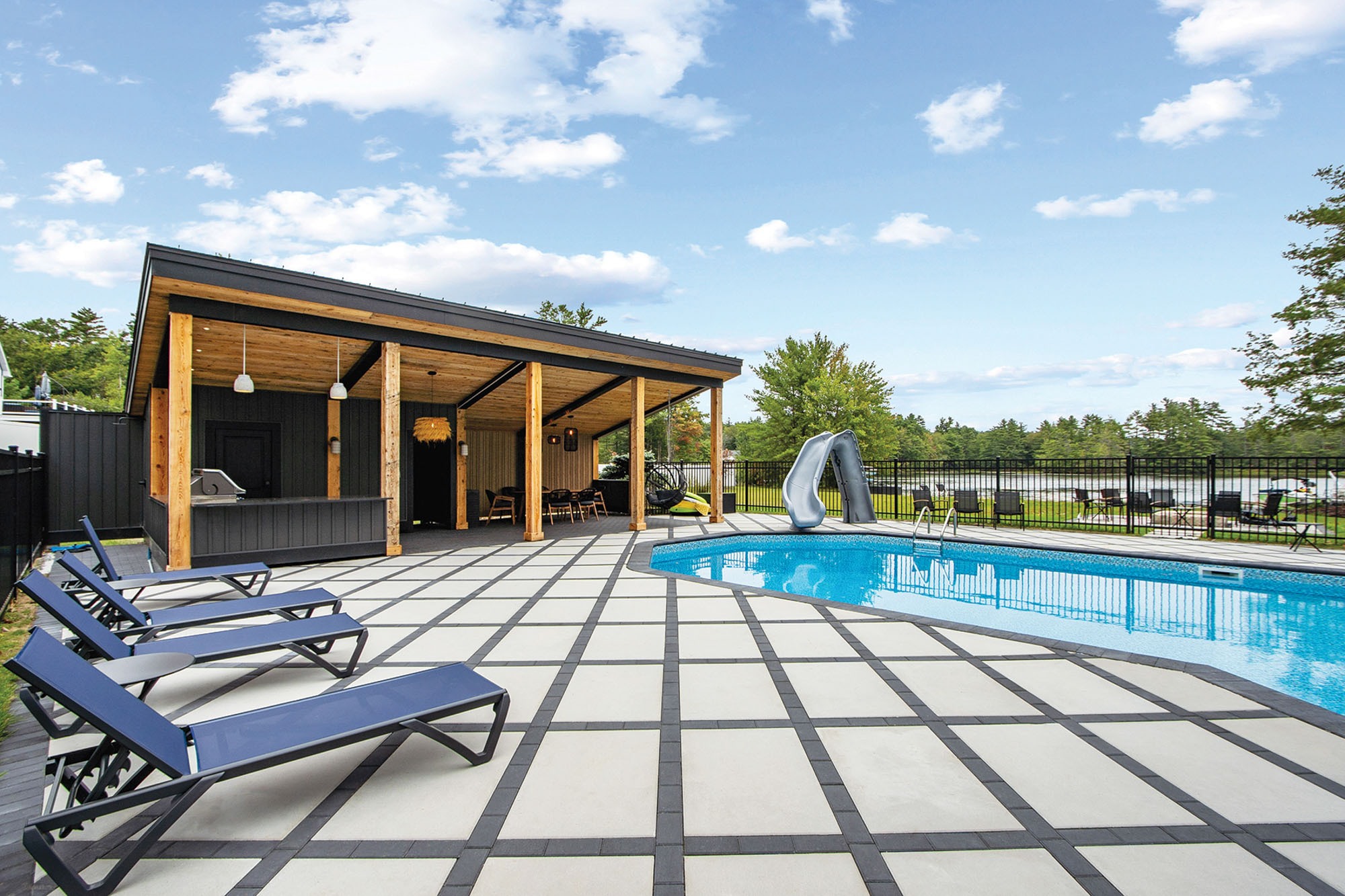 A high-end pool area deserves more than function—it should impress from every angle. This space uses pool deck pavers to create a clean, modern look with subtle complexity. Large-format Alpine Contemporary 24x36 pavers in Dove Gray form the foundation, offering a sleek visual rhythm underfoot. But the clever use of Holland Stone in Raven adds scale, depth, and movement. The design feels balanced and intentional by interweaving this smaller paver in a geometric pattern across the deck and under the shelter.