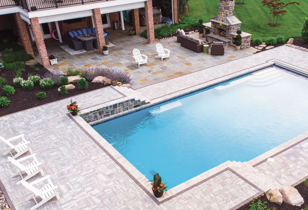 The pool area, wrapped in Nicolock’s Stone Ridge pavers in Oceanic Blue, provides a sleek, modern surface that complements the sparkling water. These pavers feature Nicolock’s exclusive paver-shield™ technology, ensuring vibrant color and lasting durability, even through freezing winters and scorching summers. The subtle blend of blue-gray tones mirrors the sky and water, creating a peaceful, resort-like setting right at home.