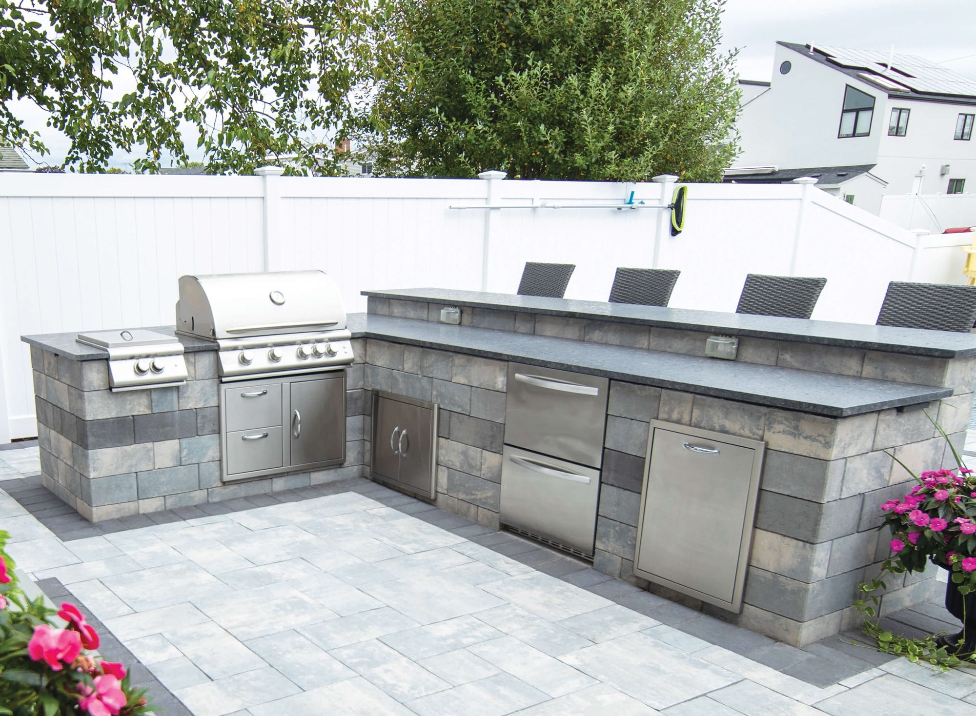 Every backyard has potential for gathering, unwinding, cooking, and connecting. When thoughtfully designed, your outdoor space becomes more than an afterthought. It becomes part of your everyday lifestyle. This custom outdoor kitchen does just that. Built with Nicolock outdoor dining products and finished in Stonegate® Contemporary Wall in Oceanic Blue and Granite City Blend, it strikes the perfect balance between sleek design and lasting performance.